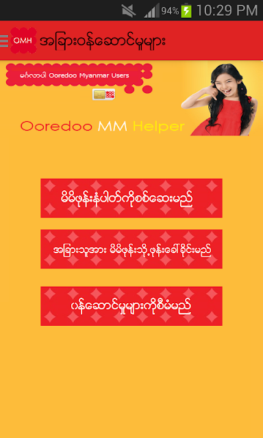 Ooredoo MM Helper v1.1 for Android ကုိေအာက္က link မွာရယူနုိင္ပါတယ္။